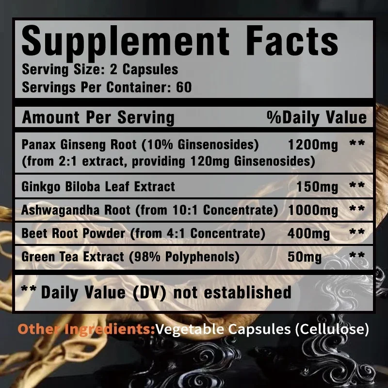 FÓRMULA ESPECIAL 5 EN 1: El suplemento de ginseng contiene una gama de ingredientes puros, como ginseng, ginkgo, ashwagandha, remolacha y té verde.